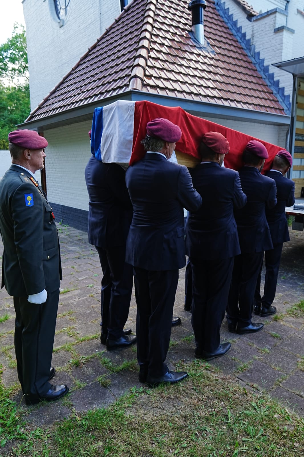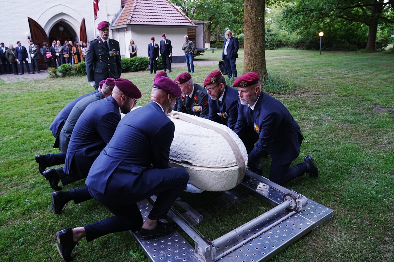 Na het welkomstwoord door initiatiefnemer en commandant draagploeg Patrick de Groot betuigde Brigadecommandant Frank Grandia zijn dankbaarheid aan en respect voor de DVLMB. Hij benadrukte het belang dat de Brigade staf ziet in het werk door de draagploeg. De verbondenheid met het werk van Bureau Veteranenzaken in het algemeen en van de DVLMB in het bijzonder zijn ook redenen om een grootscheepse verbouwing aan de Witte Kapel te bekostigen. Werk dat ook op deze dag nog in volle gang was. Na deze mooie blijk van waardering zette Patrick de eerste demonstratie uiteen en konden de genodigden getuige zijn van de verrichtingen van een draagploeg. Met de bekende focus als ware het een echte uitvaart werden diverse handelingen met kist en vlag vertoond.